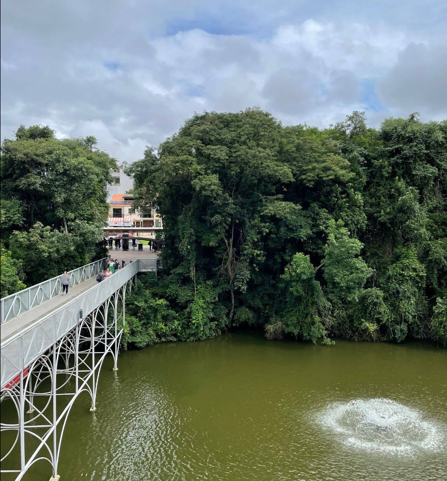 O Parque Tanguá é um dos cartões-postais de Curitiba, e seu mirante é uma das vistas mais icônicas da cidade. A estrutura, construída sobre um paredão de rocha, oferece uma vista espetacular para o lago e a cascata que corre entre as antigas pedreiras. O visual do parque, com suas passarelas, jardins e o pôr do sol, é uma experiência imperdível para quem busca uma conexão com a natureza e uma foto deslumbrante.