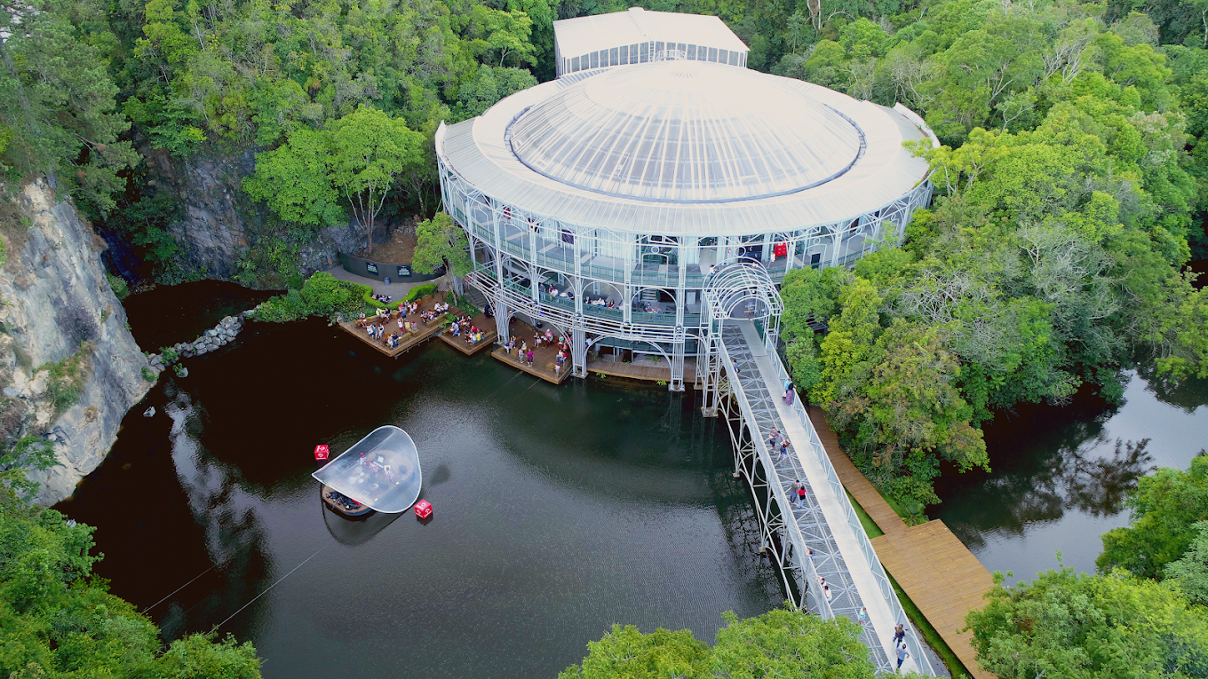 Construída sobre uma pedreira desativada, a Ópera de Arame é um teatro com uma arquitetura impressionante, feita de tubos de aço e vidro. O mirante do local oferece uma vista privilegiada da estrutura em si, que parece flutuar sobre a água, e da área de mata ao redor. É um ponto de observação que mistura arte, arquitetura e natureza, com uma vista que se transforma em um quadro vivo.